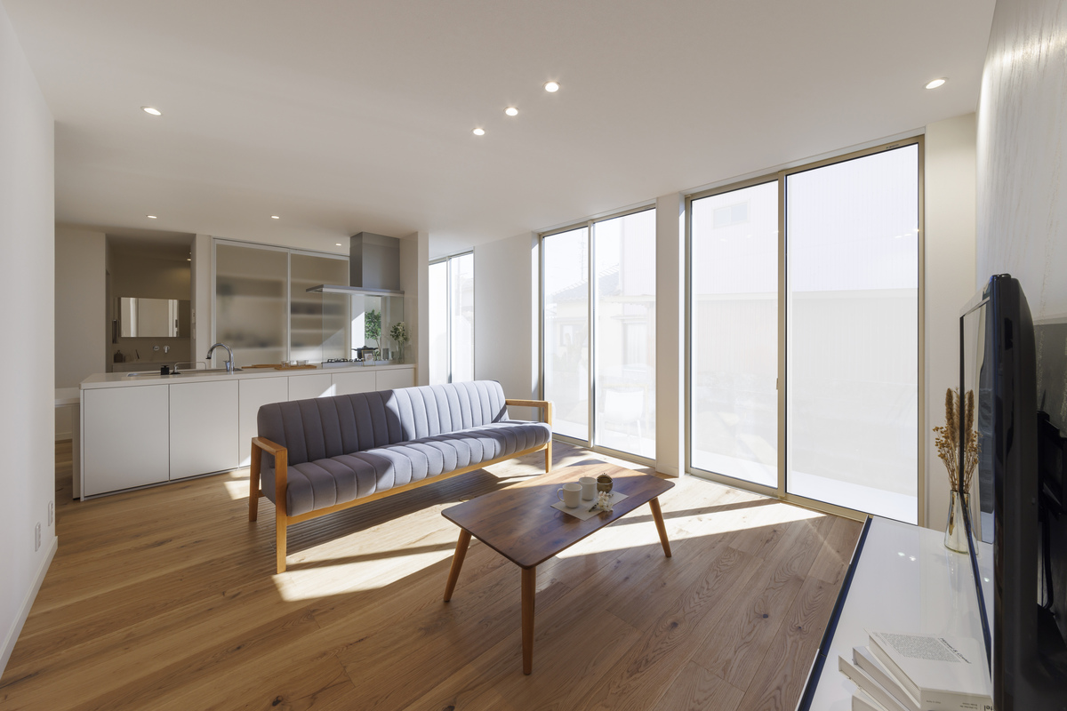 ホワイトを基調としたナチュラルなリビング。使い勝手の良いテラスが隣接しているので明るくとても開放的。