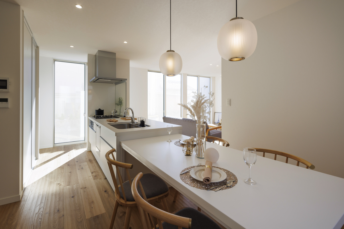 キッチンと横並びのダイニングは、北欧テイストの椅子と照明でコーディネート。
