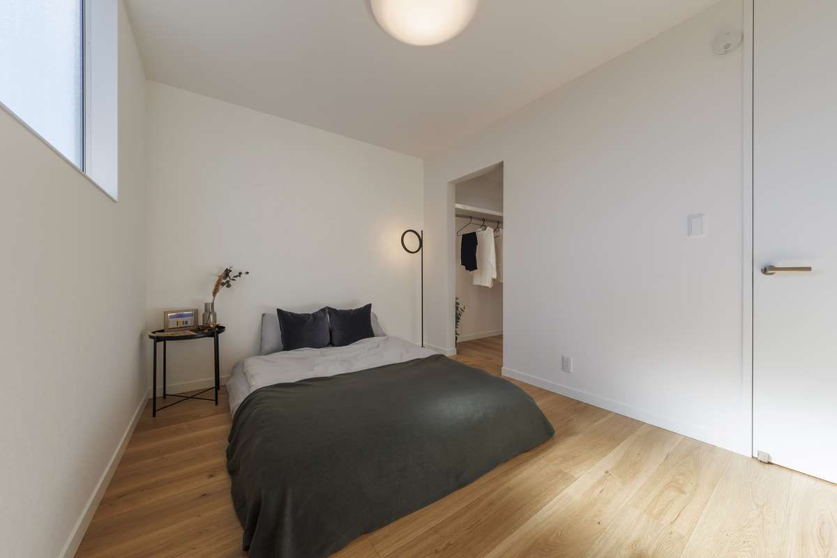 リビングからホールを抜けたとこに位置する主寝室。使いやすくたくさん収納できるウォークインクローゼットを備えました。
