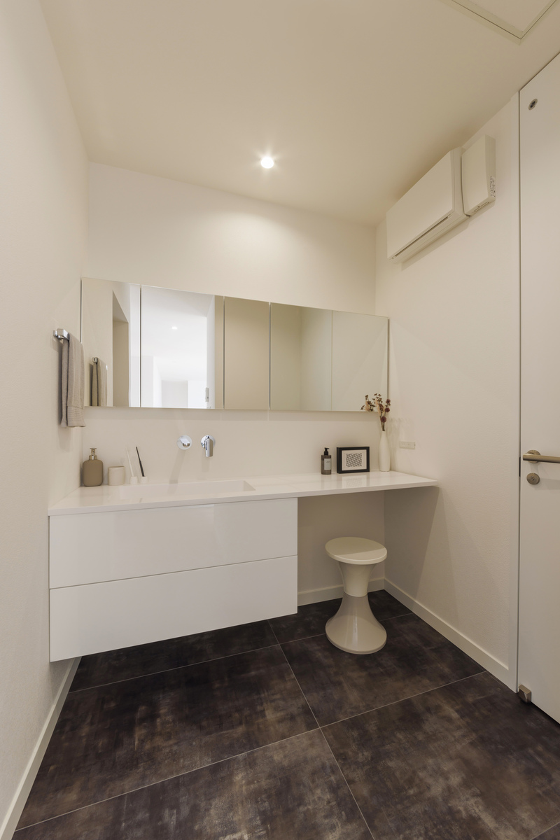 家族が横並びで使えるホテルライクな洗面室は、イタリア製のオリジナル洗面台(ルシェーロ)を採用。