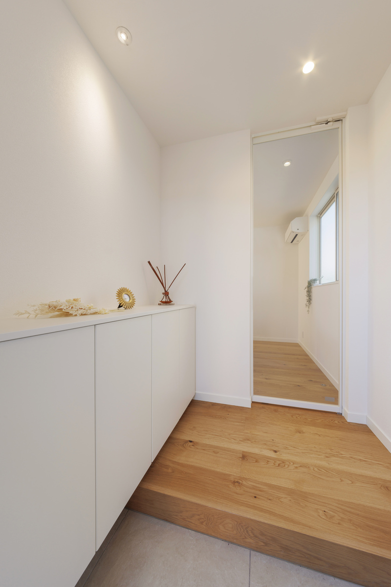ホワイト×木の玄関ホールは、ひと続きの床とガラスの引戸で視線が抜ける為、限られた空間でも閉塞感がありません。