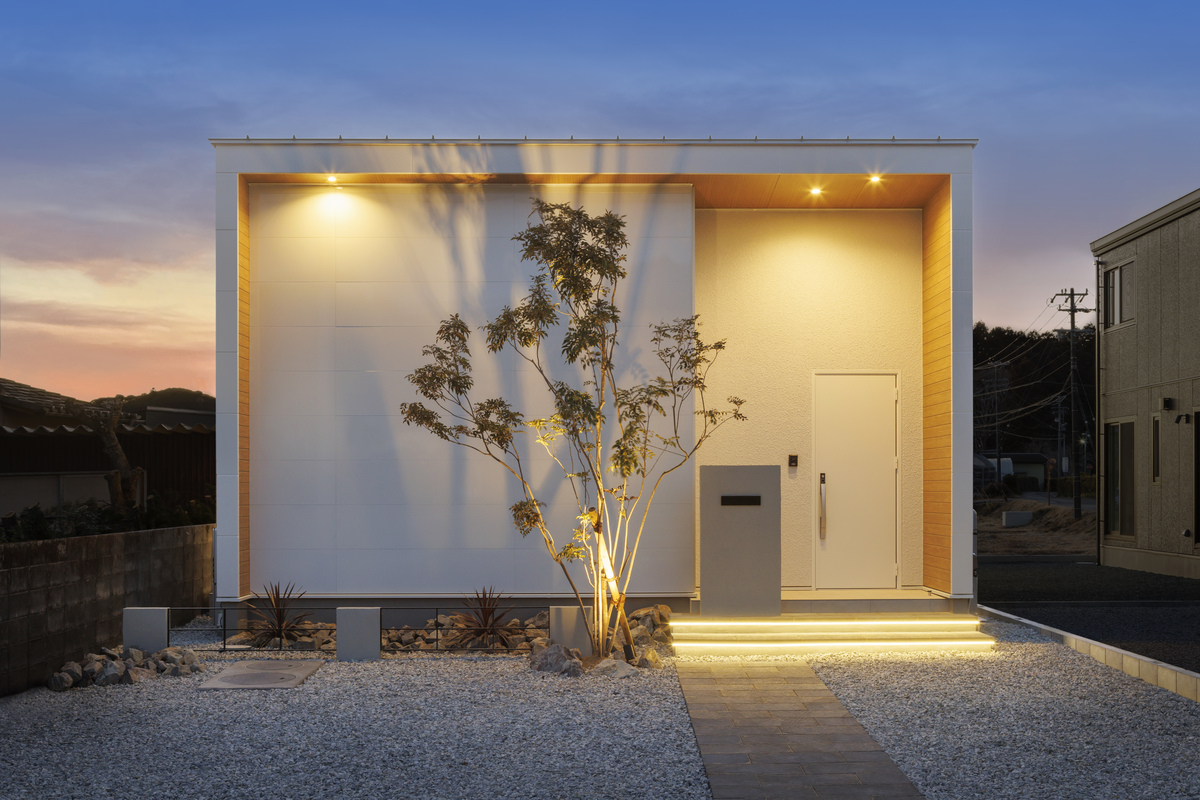 ホワイトが冴える鏡面素材の外壁が存在感を放つナチュラルかつ上質な外観。囲うような木目の軒がアクセントに。