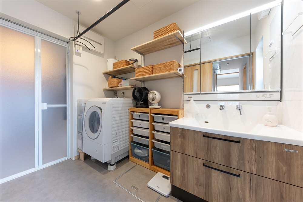 家族が並んで身支度できる幅広の洗面台を設けた洗面脱衣室。物干金物を取り付けたので洗う⇒干すの洗濯動線が最短で完結します。
