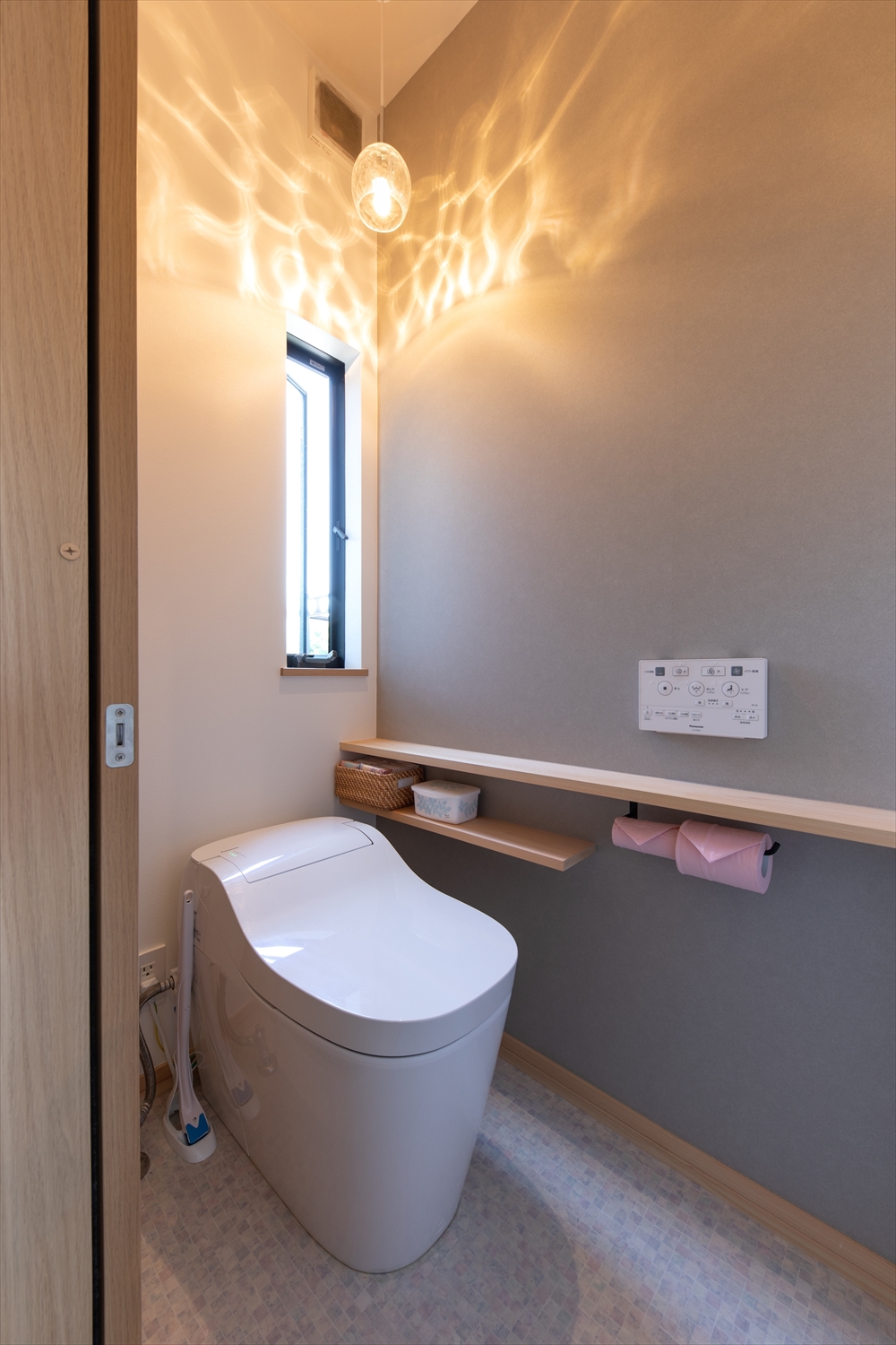 モザイクタイル調のクッションフロアや水面のように空間を照らす照明など、シンプルながらデザインにこだわったトイレ。収納できる固定棚は空間のアクセントにもなっています。