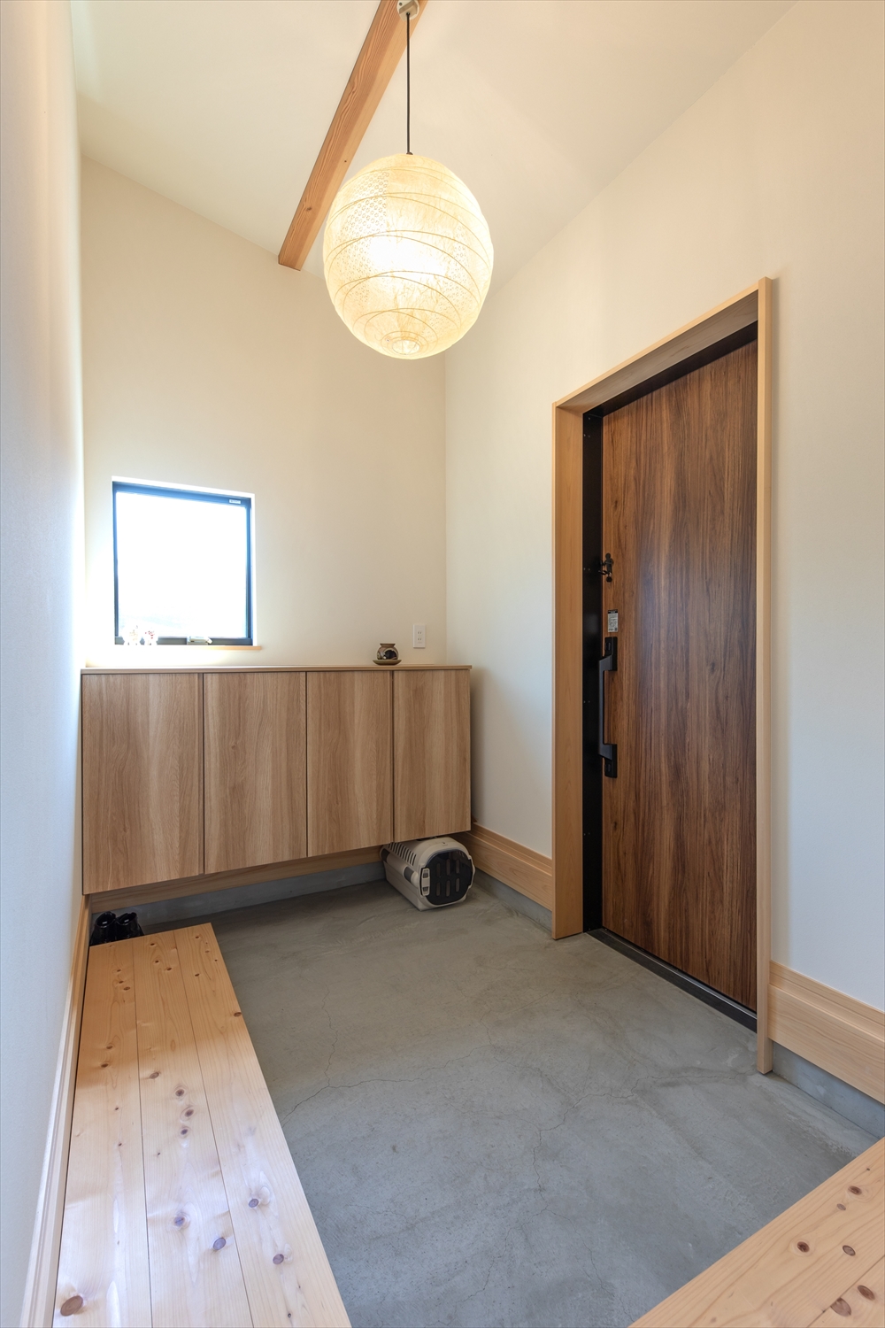 無機質なモルタル仕上げの土間に、やわらかな和紙の照明をセンス良く合わせた玄関土間。家族の仲間入りをしたワンちゃんのおさんぽグッズの収納や準備にも活躍していく予定です。