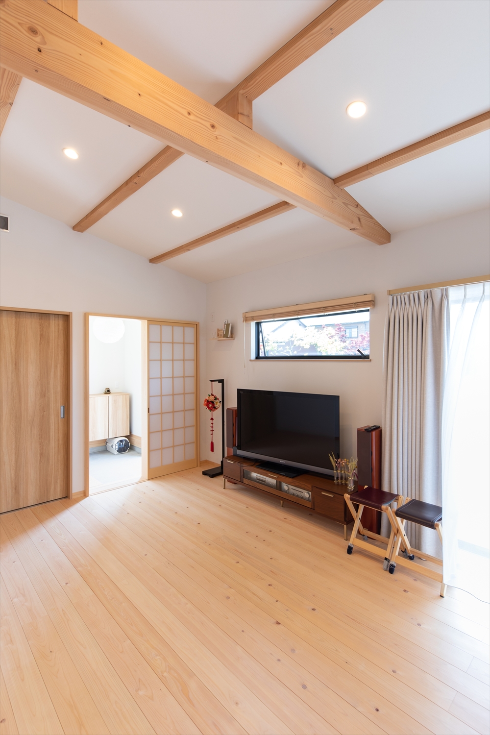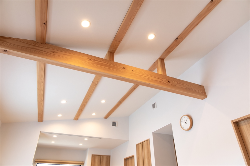 平屋ならではの勾配仕上げの天井。存在感のある梁が木のぬくもりを感じさせてくれます。