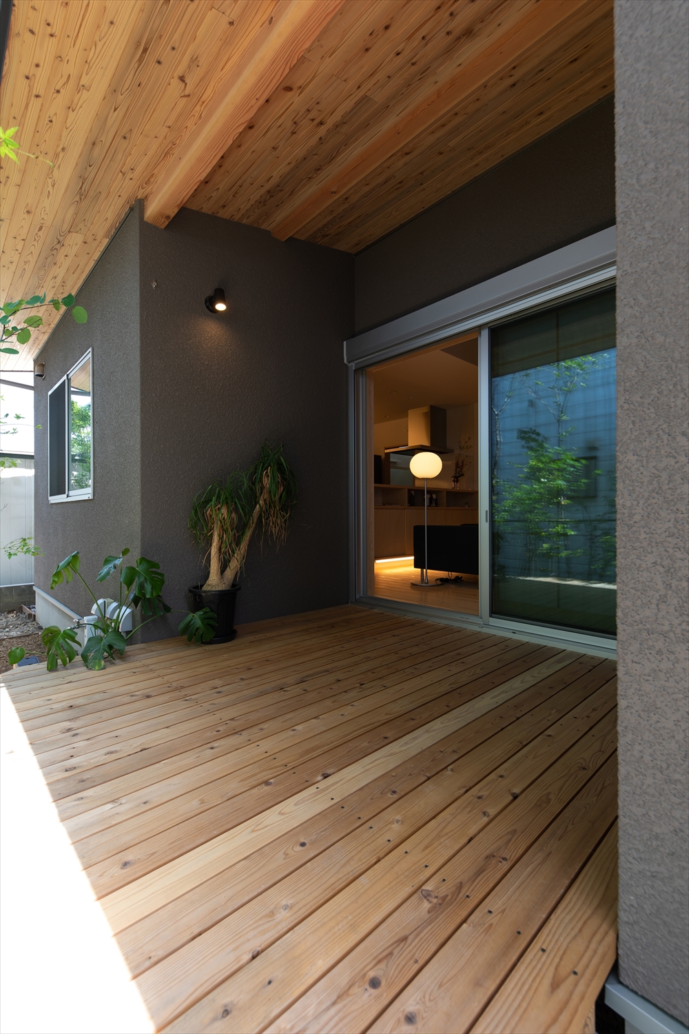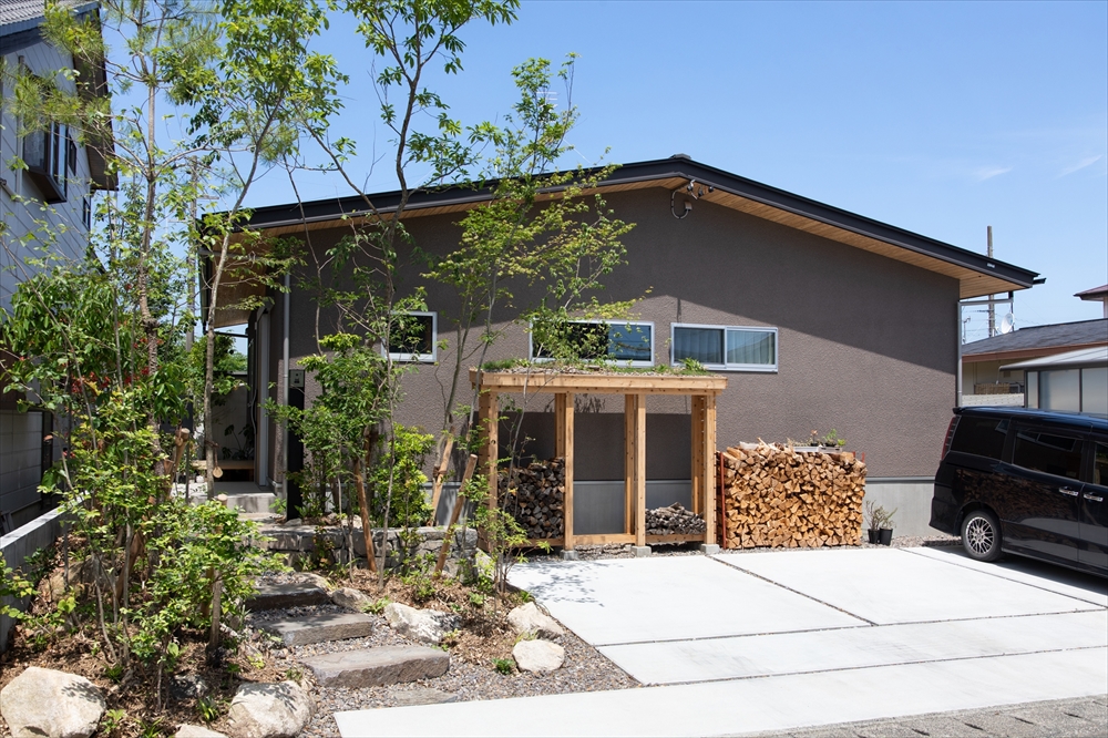 グレーの塗り壁で重厚感のある外観。軒裏の杉板がアクセントになっています。