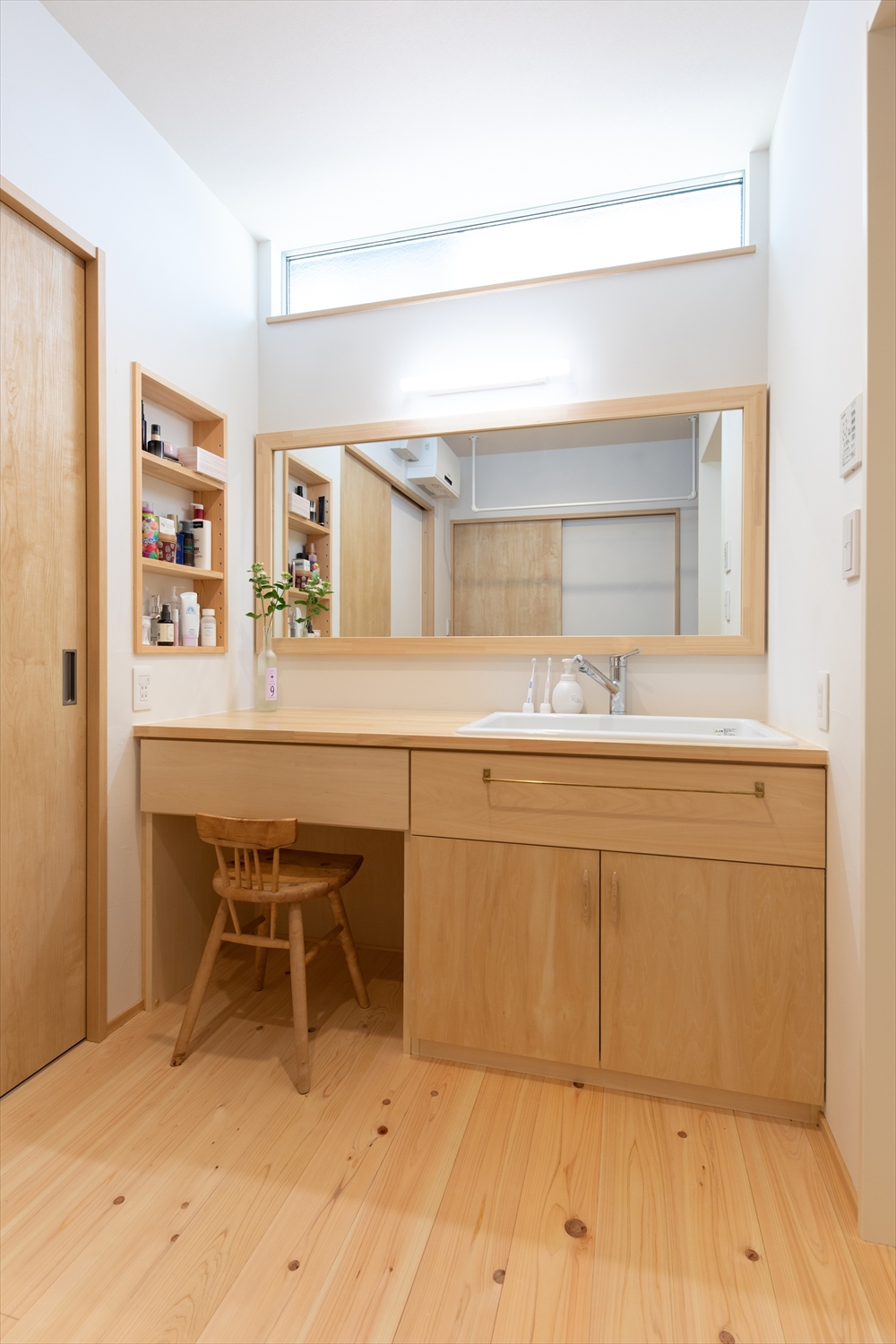 ドレッサーとしても使える幅広の造作洗面台。広い洗面ボウルはお洗濯の下洗いにも便利です。