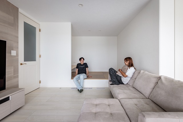 LDKの南側には大きな窓を採用し、外にタイルデッキを設けることで視線が抜け、室内に広がりを感じさせる仕掛けも。