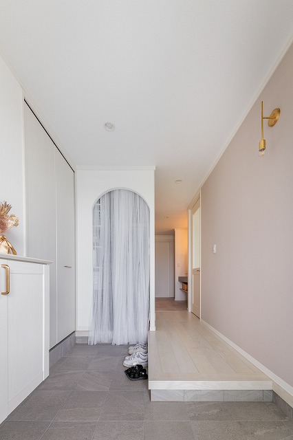 玄関に一歩足を踏み入れると、目に飛び込んでくるのは、かわいらしいR壁が特徴のエントランス。 まるで雑誌の一ページから飛び出してきたかのような、おしゃれなデザインが訪れる人々の心を掴みます。