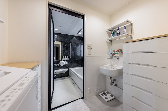 奥さまこだわりの洗面は、SNSで憧れていたアイカを採用し、インテリアコーディネーターと一緒に、照明やタイルまで丁寧に選んだ力作。 娘さんが2人いることから、将来、お化粧と身支度が同時にできるように幅広のゆったりサイズを選択。