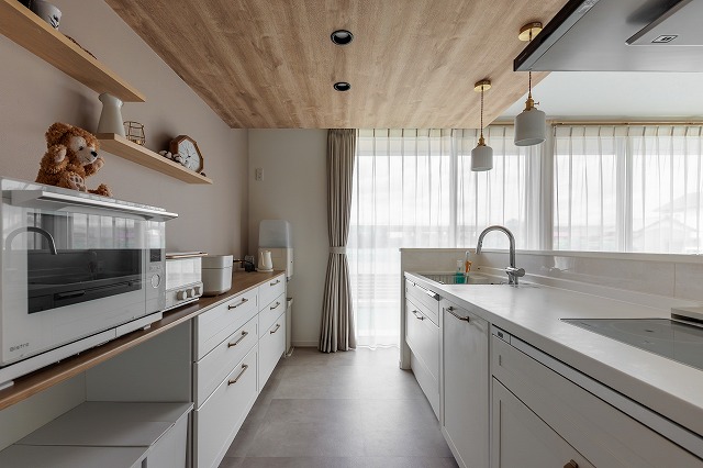 こもり感のある落ち着いた印象を与える下がり天井のキッチン。