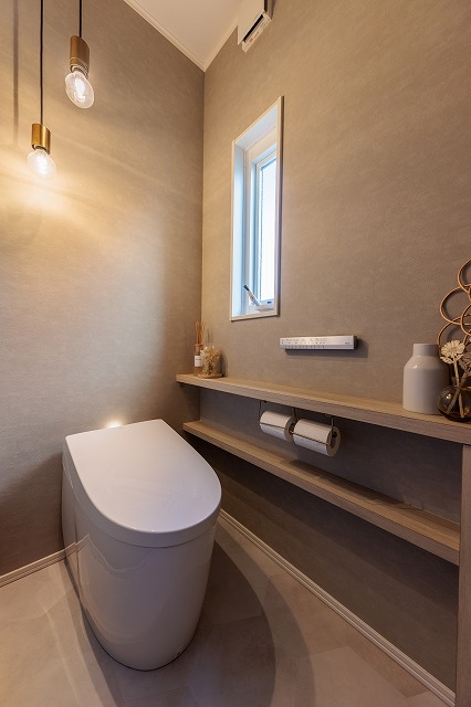 2つあるトイレのひとつに念願の小便器を採用し、落ち着いた空間に仕上げました。