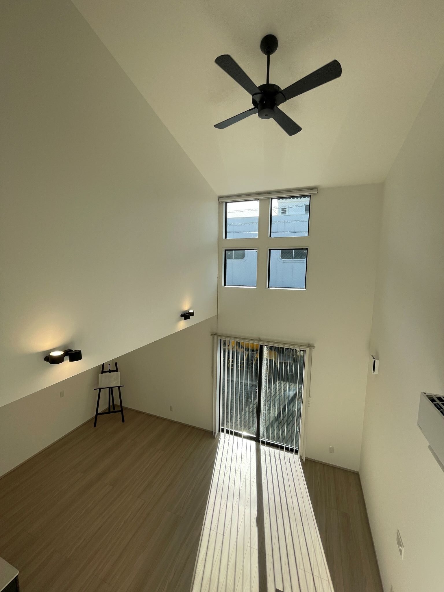 大きな吹抜けから降り注ぐ光が全体を優しく包み込む、明るいLDK。