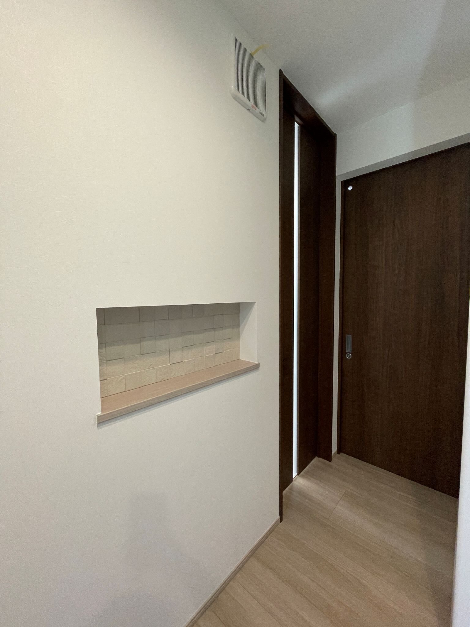 玄関のニッチは、鍵を置いたり、季節のものを飾ったり。 1階はイシカワのブローボックスを採用で、室内の温度・湿度が均一で快適。