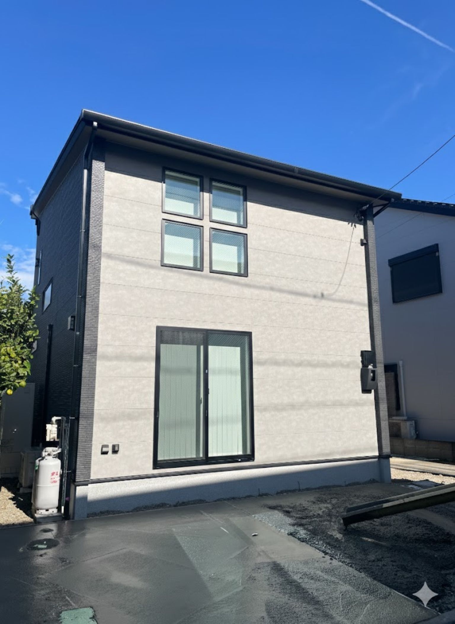ブラック×グレーの外壁がつくる、端正な佇まい。 正面に表情を持たせた、シンプルで上質な外観です。
