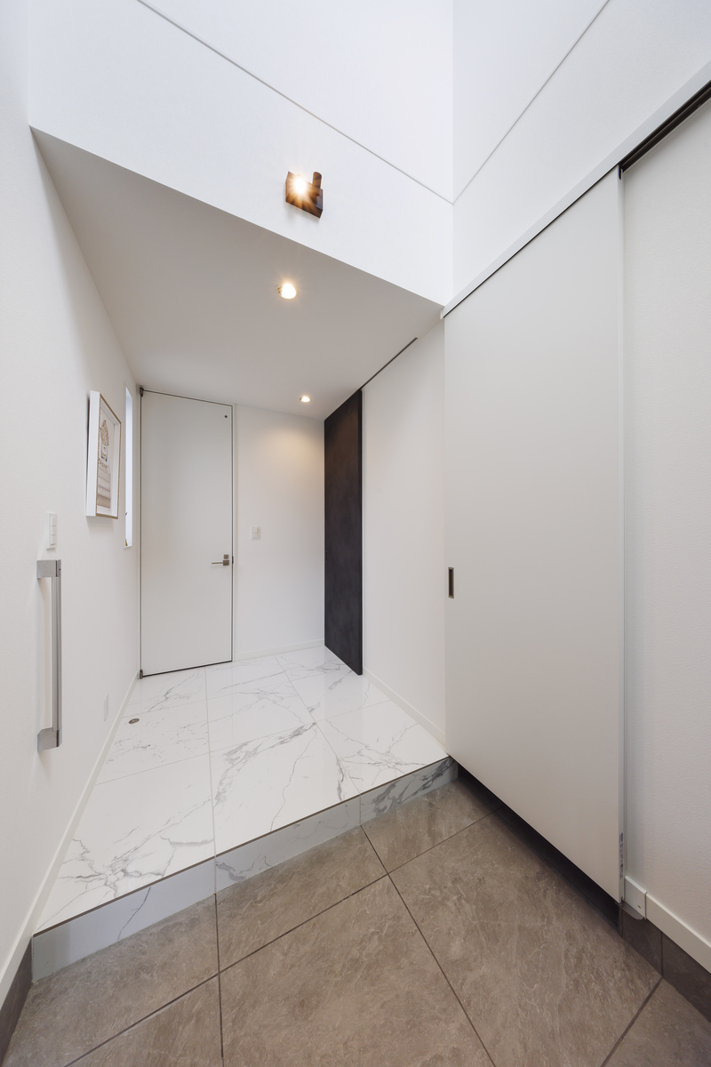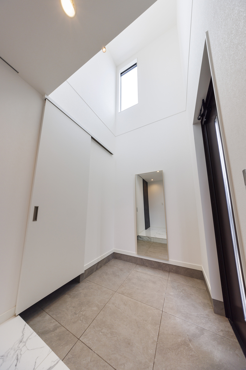 玄関ドアを開けた瞬間、誰もが歓声を上げる吹き抜けのエントランス。真っ白で統一し、より高級感を演出しています。右側の引き戸を開けるとシューズクローゼットからサニタリーへとつながります。