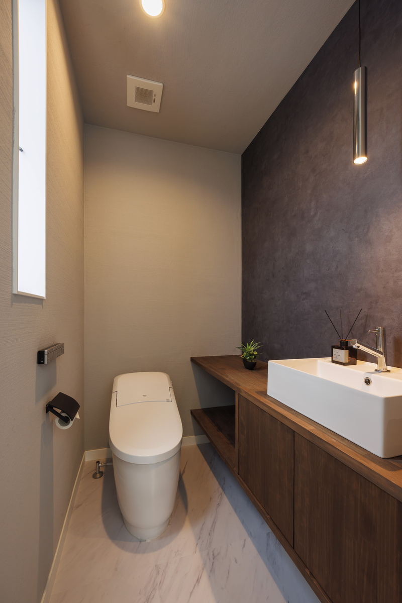 濃いグレージュのクロスがアクセントのスタイリッシュなトイレ。デザイン性だけでなく、大容量の収納棚を造作して実用性も高めています