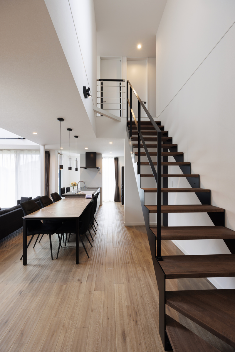 リビング階段をスケルトンにしたことで視線が抜け、より開放感が生まれました。大きな吹き抜けを通して、家族がどこにいてもスムーズにコミュニケーションがとれます