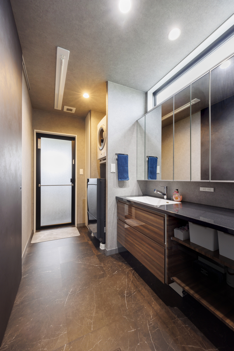 ご夫婦の憧れを形にしたホテルライクなサニタリー。玄関ホール→シューズクローゼット→洗面脱衣室→ランドリー→浴室へとつながる動線が一直線に繋がっいて、帰宅後の動線と家事ラク動線両方を叶えました。
