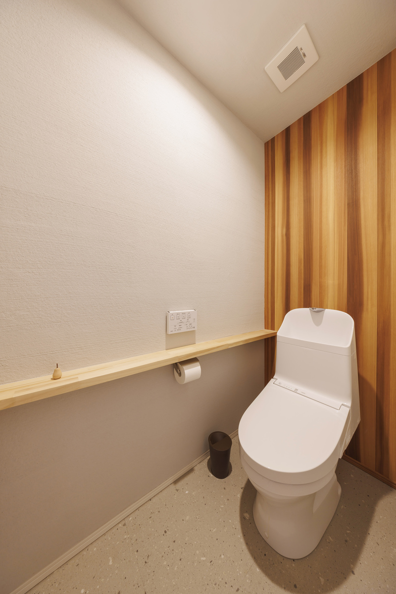トイレには消臭効果にすぐれた薩摩中霧島壁を天井と壁に採用。木目のデザインクロスを一面に貼り木の温もりを加えました。