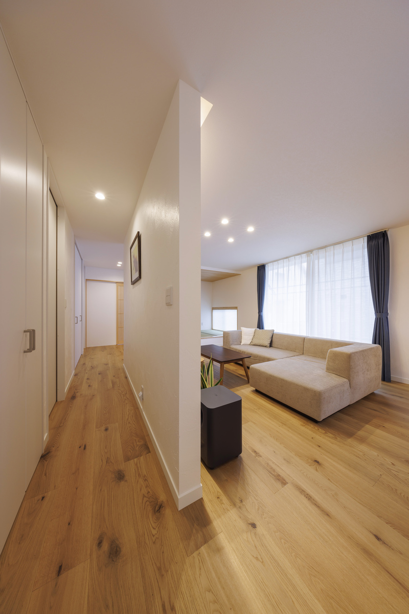テレビの背面に壁をつくり、LDKとその他の空間を緩やかにゾーニング。廊下側の壁には奥さまが色鉛筆で描いた作品が飾られ、ホームギャラリーとしても利用できます。