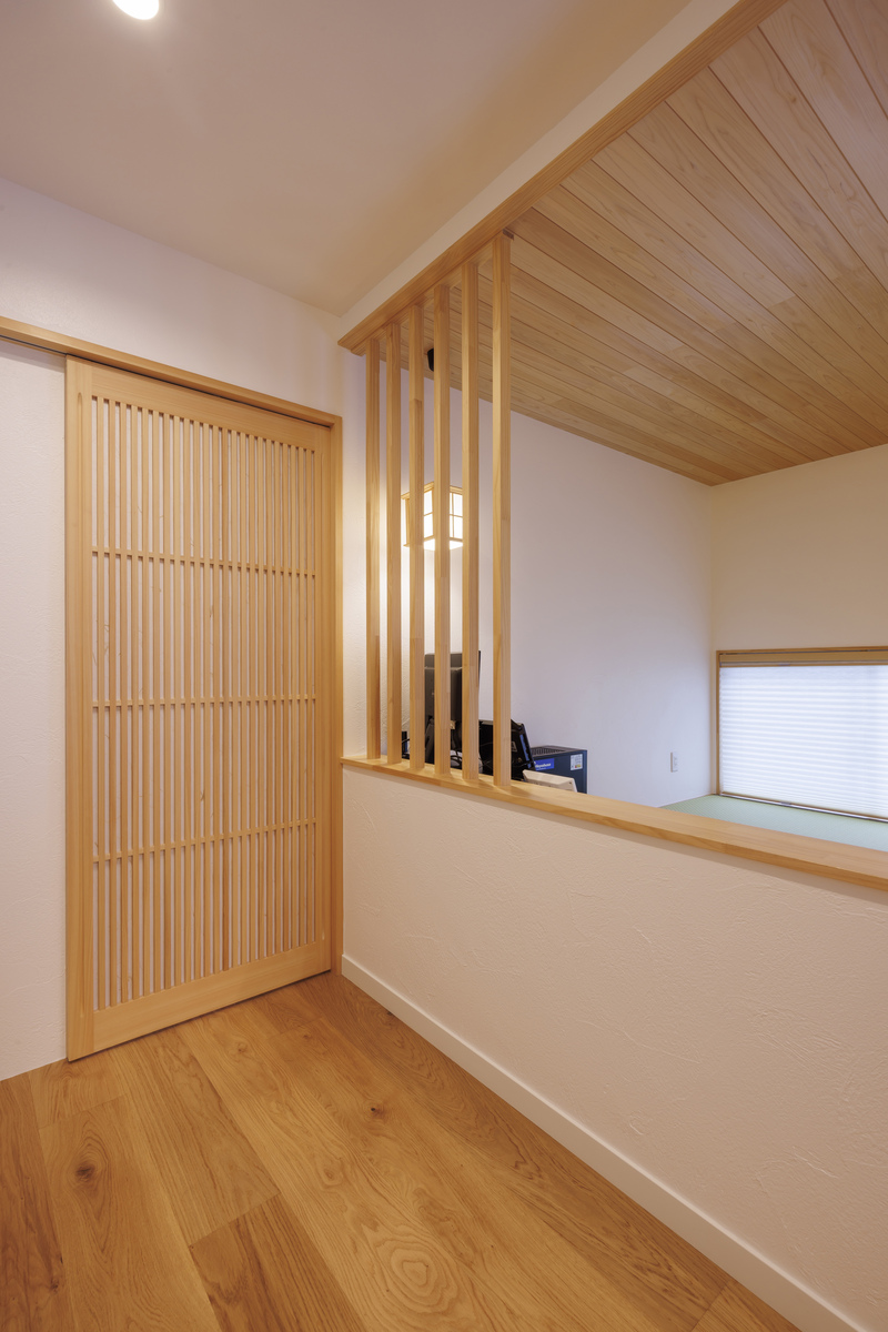 小上がりの畳スペースは、無垢のレッドシダーを貼った下がり天井、外の景色が見える地窓、座机のようなカウンターを造作し、書斎として利用されています。格子の引き戸に合わせて、腰壁と天井の間に格子のデザインを取り入れました。