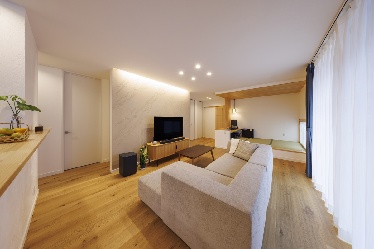 木の温もりと優しい色味が調和したLDK。テレビ背面の壁にイタリア漆喰「ユーロスタッコ」を採用。天井から注ぐ間接照明が空間を上品に演出します。