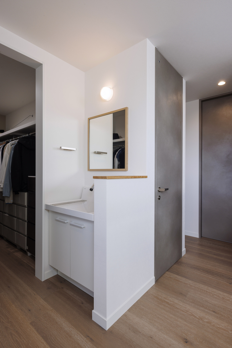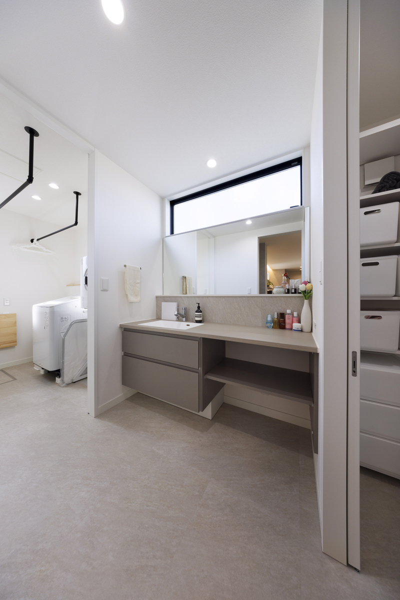 浴室・脱衣室・洗面室・ランドリーと一直線に並ぶ「神動線」を実現しました。洗面室は広くとり、鏡も大きめに。ランドリールームには「乾太くん」と靴も洗えるスロップシンクを設置しました。「もう、本当に家事がラクになりました」と話す奥さまの言葉に実感がこもっています。