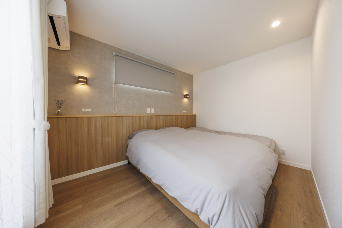 木の温かみがある主寝室。間接照明とダウンライトで明るさを調整します。