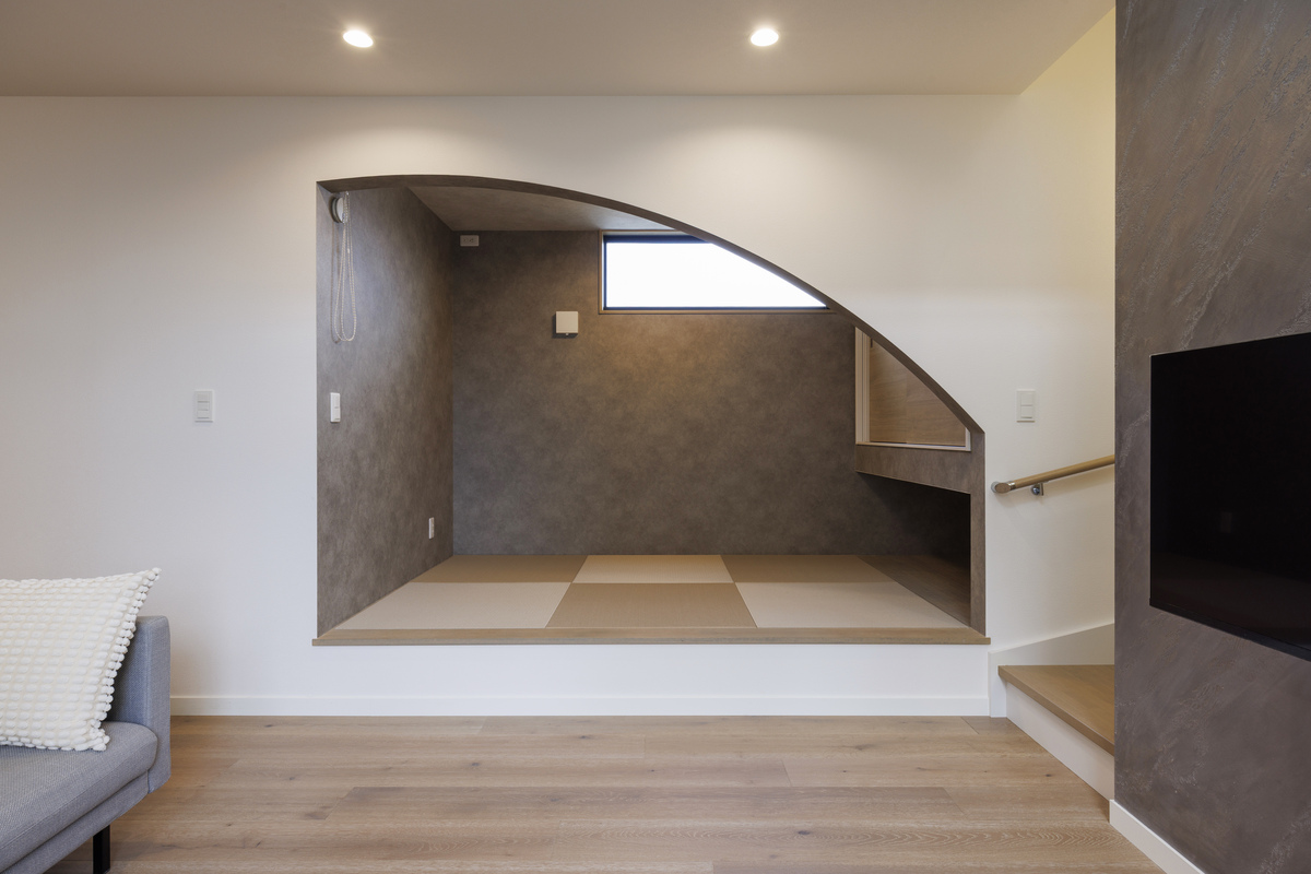 リビングの一角に設けた小上がりの和室。垂れ壁をアーチ形状に切り取って、モダンな空間に。子どもたちがここで遊んでいる様子がキッチンから目が届くので安心です。ゲストが泊まりに来たときは、ロールカーテンで仕切ることもできます。