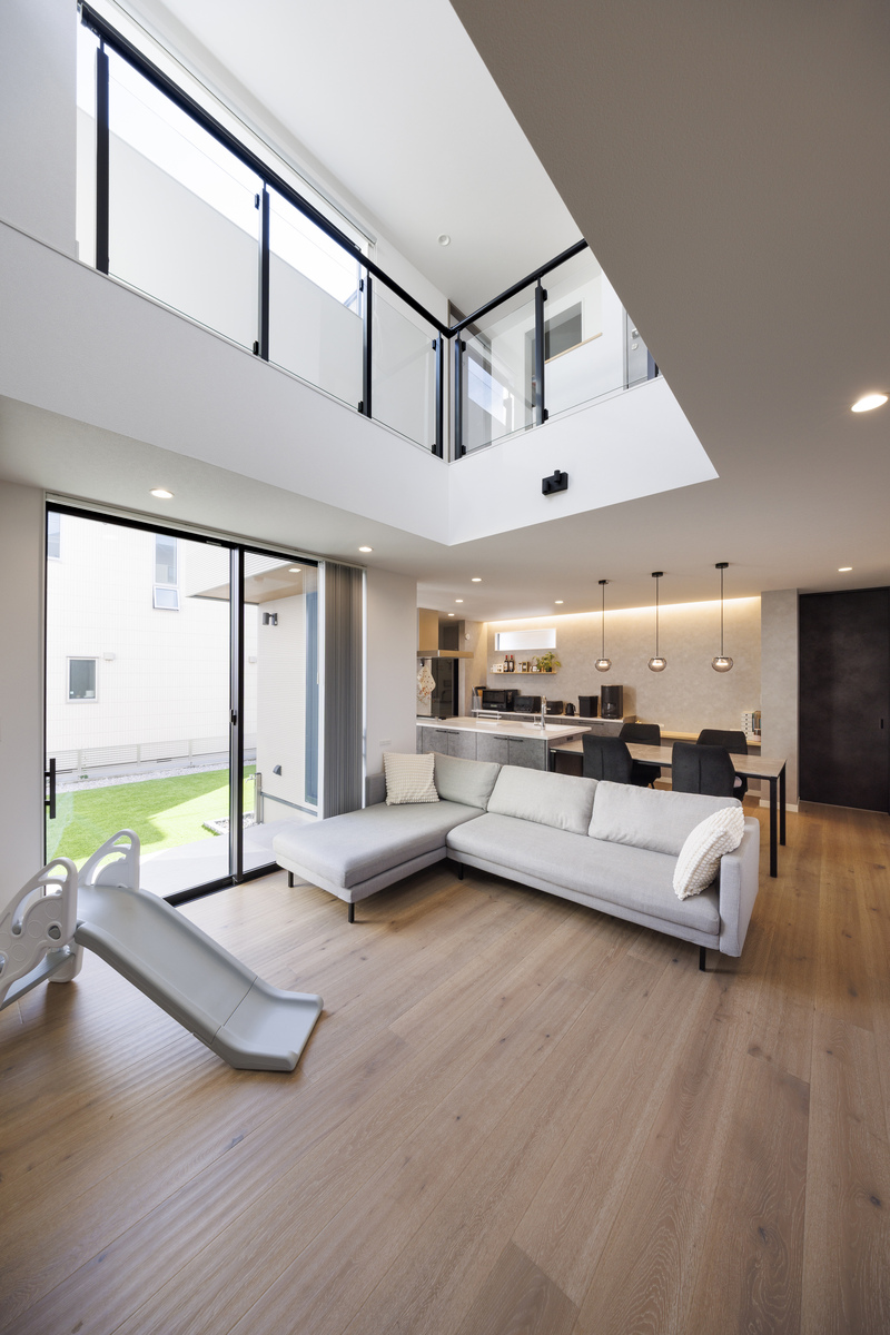 大きな開口部と吹き抜けから光が注ぐ開放感あふれるリビング。凹凸のある床は『nattoku住宅』オリジナルの無垢フローリングで、足裏に心地よさが伝わってきます。