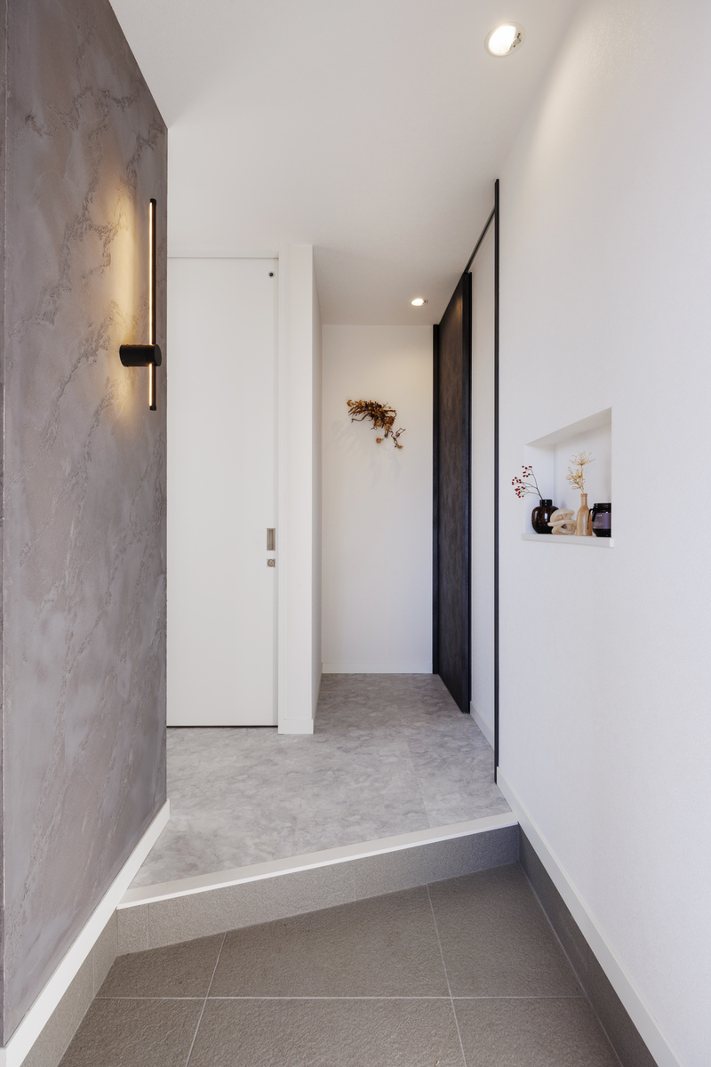 白とグレーで構成された玄関ホール。シューズクローゼットとの境目となる壁にアーティスティックなイタリア漆喰「ユーロスタッコ」を塗ってアクセントをつけました。