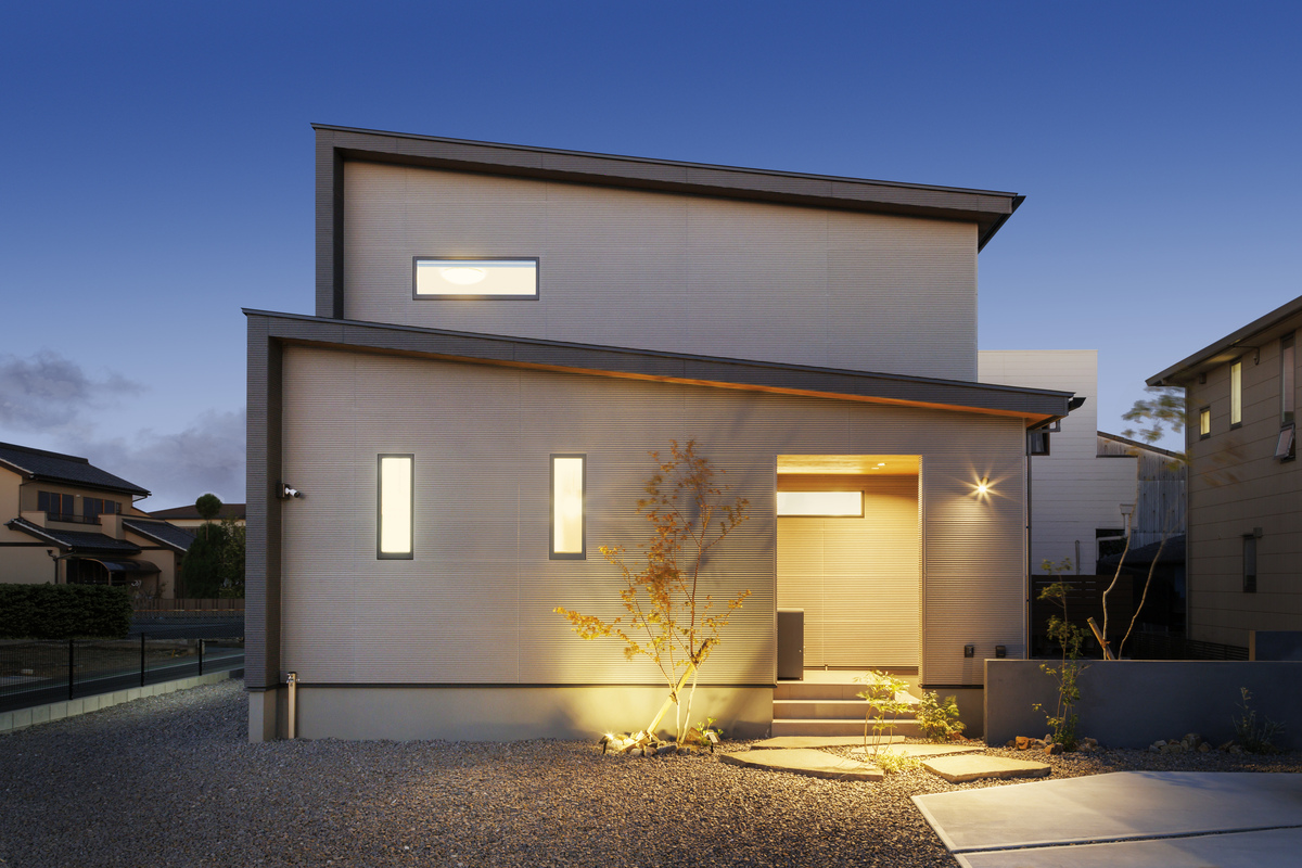 ライトグレーのALCと深めの軒がバランス良く融合した外観。日が暮れると、シンボルツリーが美しくライトアップされます。窓を少なめにしてプライバシーを守り、リビングの吹き抜けから自然光を取り込む設計手法を採用しました。