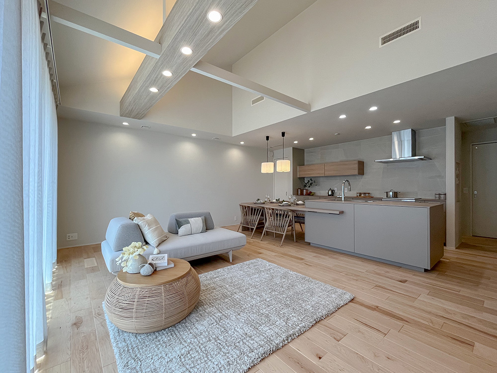 - 木の質感豊かな「ジャパンディ」スタイルのインテリアと、吹き抜けのある大空間LDK。