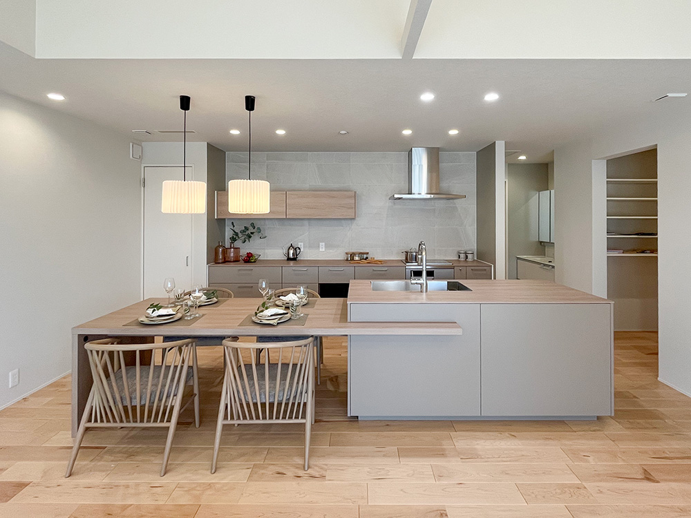 キッチンハウスの二列型キッチン。ダイニングと一体のデザインで、まるで家具のよう。 レンジフードが壁側にあるため、空間全体がスッキリと見えます。