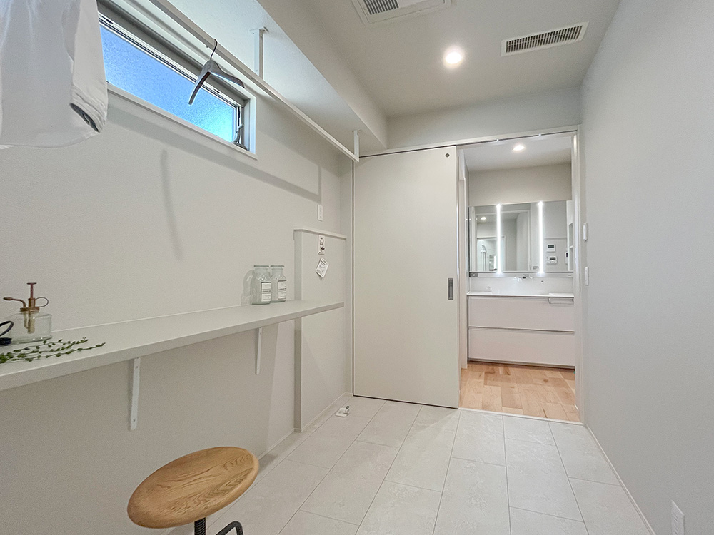 広々としたランドリールームは、室内干し用ポールに加え、アイロンがけなども行えるカウンターを設置。洗濯周りの家事はここですべて完結します。