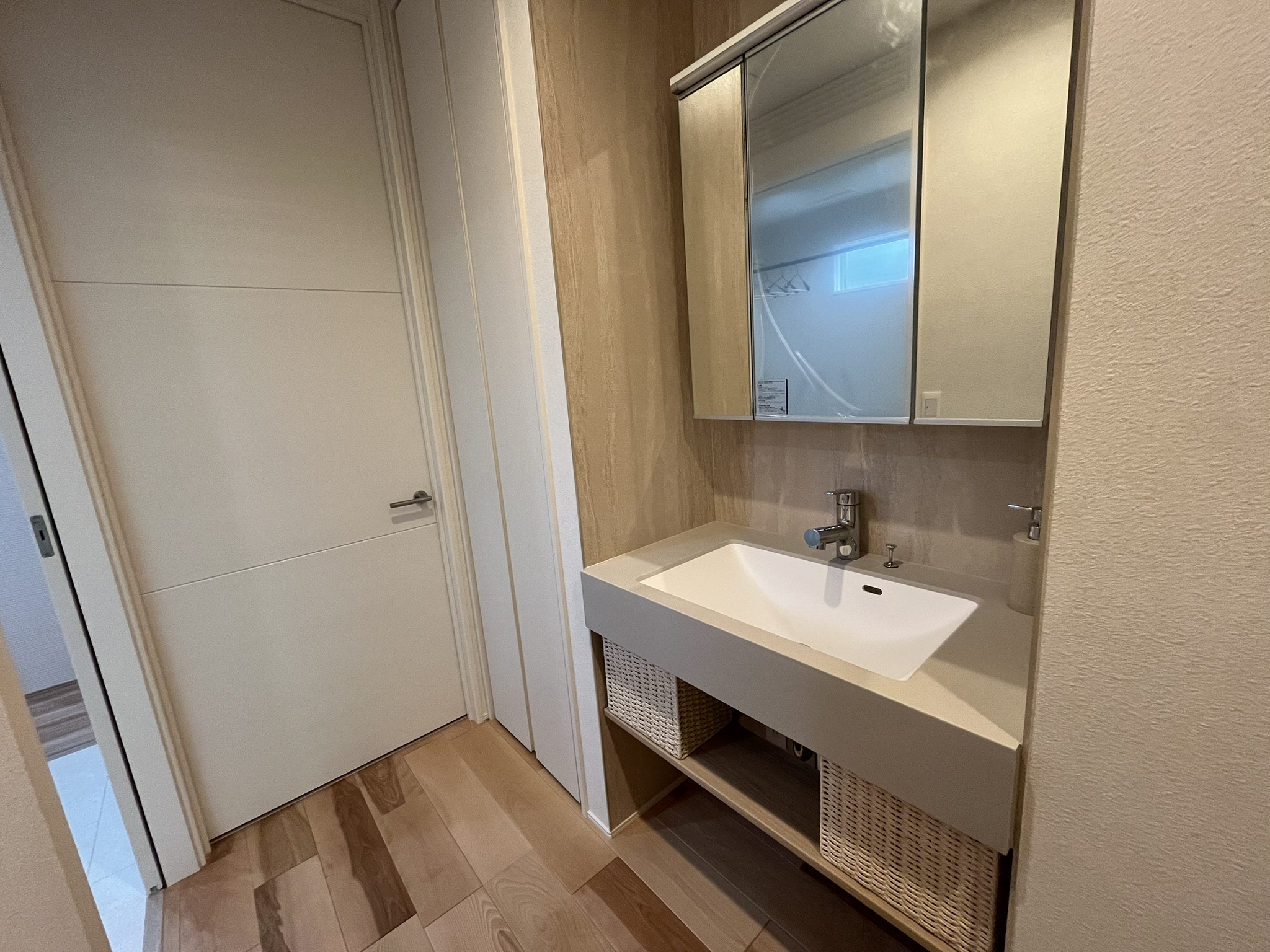 くすみカラーがかわいい造作洗面は、ナチュラルなインテリアに溶け込みます。