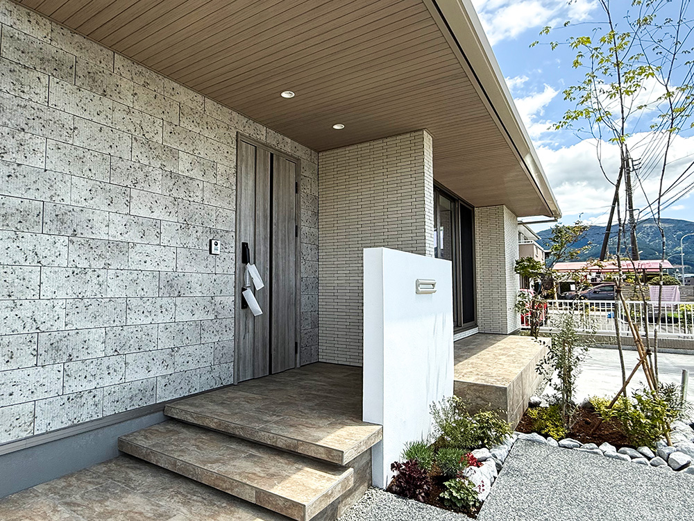 深い軒と大判タイルが重厚感を感じさせます。 こちらの大判タイルは、玄関ホールにもアクセントで取り入れ、統一感を出しました。 一癖あるポーチタイルも印象的。