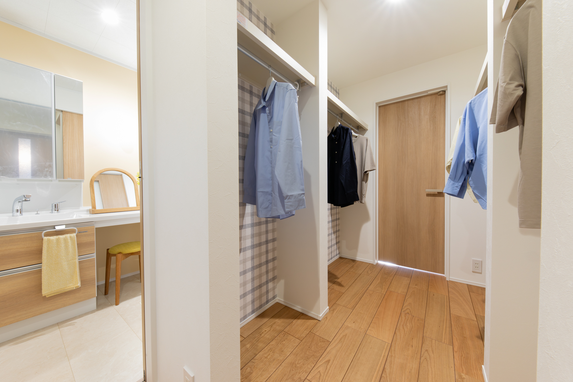 廊下からアクセスができるためみんなで使いやすい共有スペース。 主寝室・洗面脱衣室と回遊できるので、家事動線の短縮も◎。