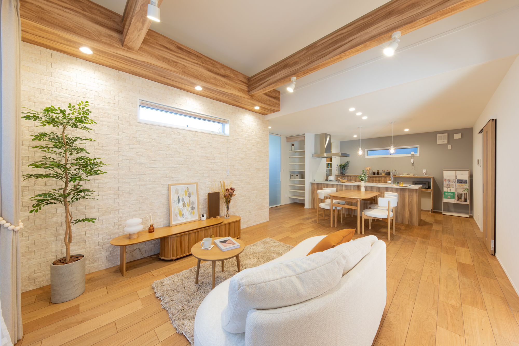 20.5帖のLDKは勾配天井を採用してさらに開放的に。 アクセントの梁が空間に立体感をもたらします。