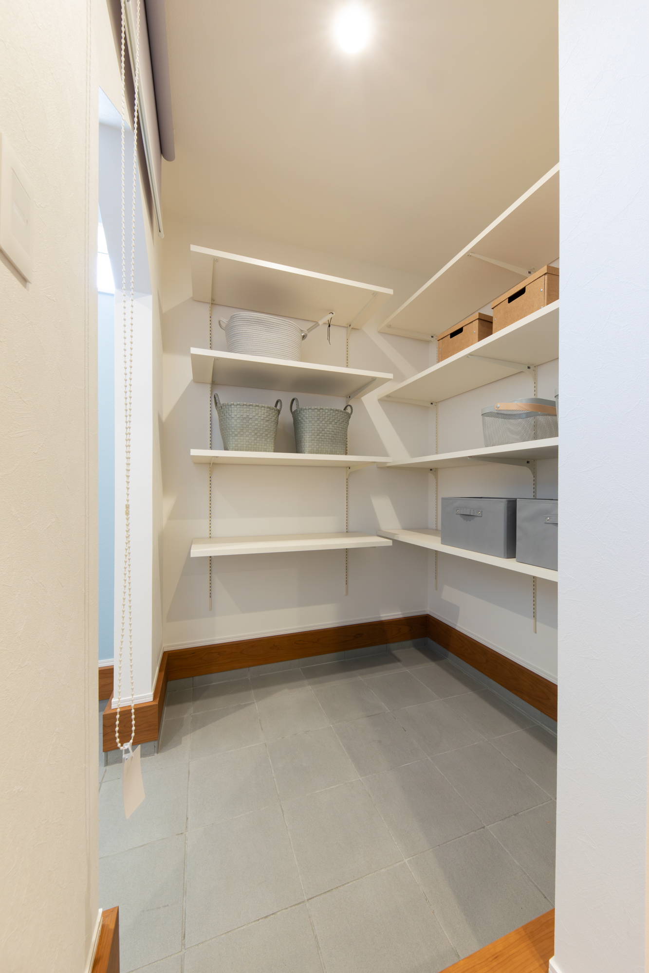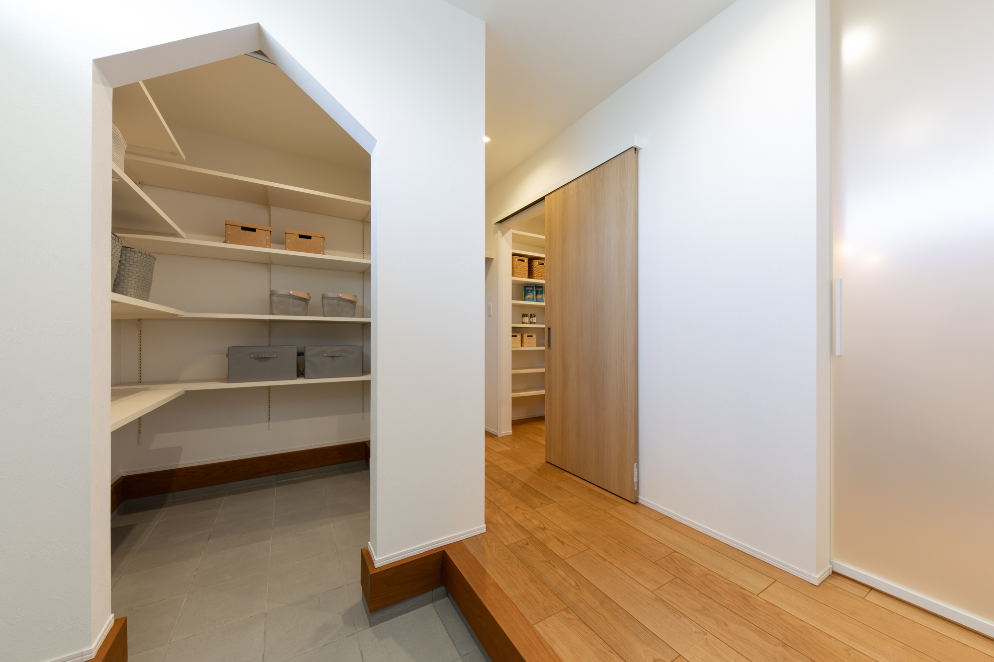 玄関からパントリーを経由してキッチンへ通じる お買い物帰りには嬉しい動線です。